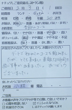 小林様【山梨県甲府市グルメレストランナチュラルグレースのランチ&ディナー】