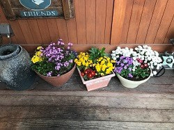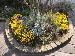 玄関には、パンジーやビオラや雪柳、その他いろいろな花が咲いています。