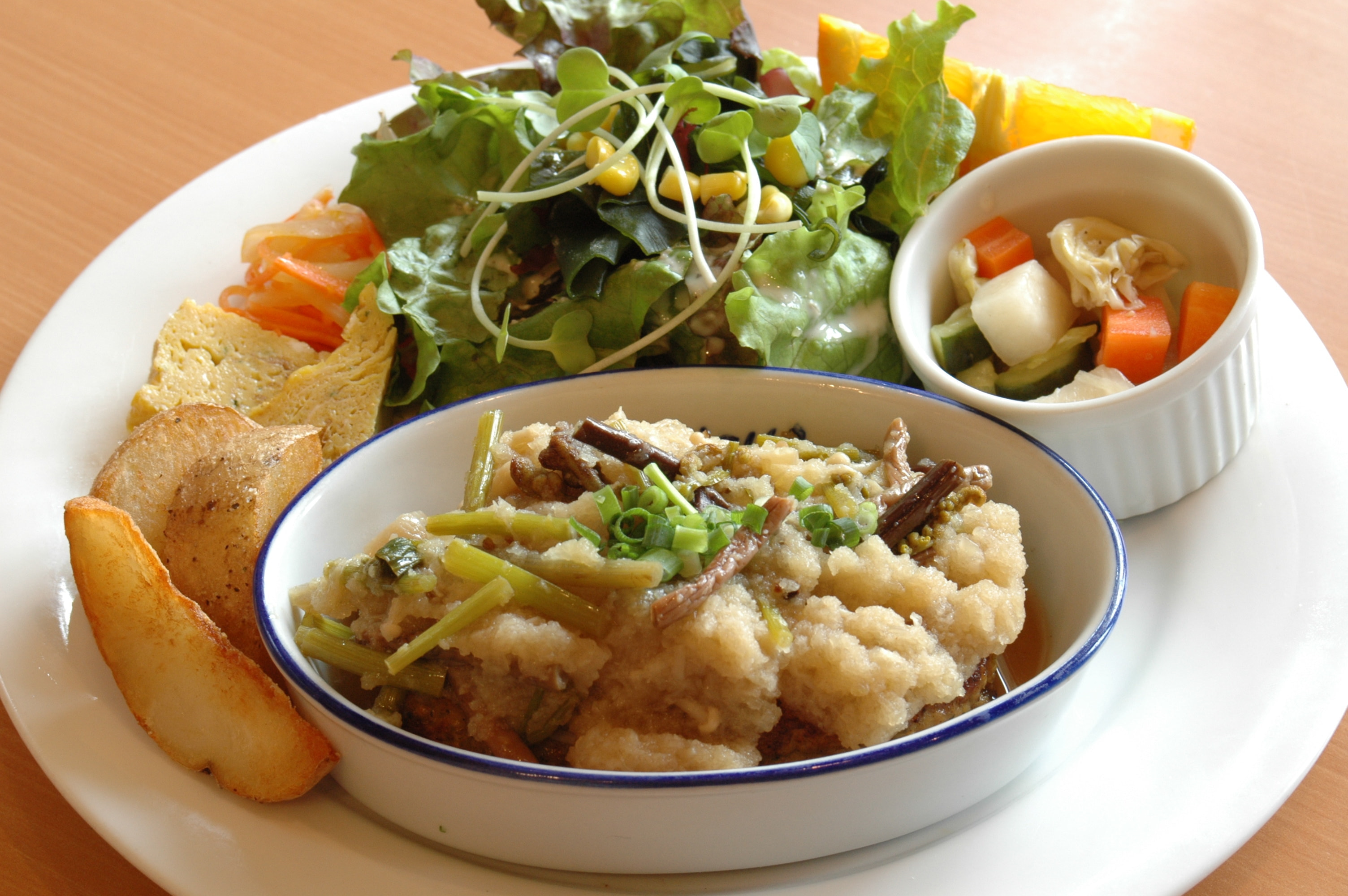 自家製の有機豆腐ハンバーグに旬の国産新物山菜がたっぷり入った特製おろしソースを