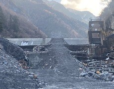山沿いの道が崩れてダムも土砂で埋まったのでダムの真ん中に道を作ったようだ!