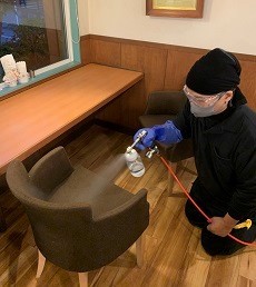 これらの菌を不活性化する加工です。リン酸チタニア系化合物液を媒体問わず噴霧できるとのことですので、お客様やスタッフなどが触れる箇所を散布しました。