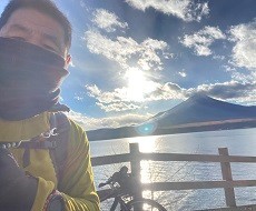 西湖湖畔を自転車で紅葉と湖と富士山を見ながら日差しを浴びて楽しいサイクリング。