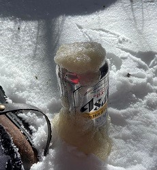 ダウンジャケットを着て雪の上にオーバーズボンを敷いてその上に座り、足にダブルの冬用ジャケットかけて手袋したまま食事にする。