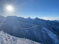 目の前には、八ヶ岳の主峰赤岳に硫黄・阿弥陀岳、その後ろには南アルプスの山々。